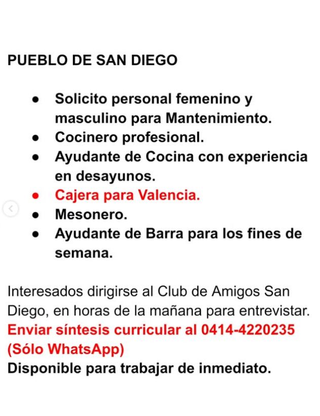 PUEBLO DE SAN DIEGO. Solicito personal femenino y masculino para Mantenimiento.Cocinero profesional. Ayudante de Cocina con experiencia en desayunos. Cajera para Valencia. Mesonero. Ayudante de Barra para los fines de semana. Interesados dirigirse al Club de Amigos San Diego, en horas de la mañana para entrevistar. Enviar síntesis curricular al 0414-422.02.35 (Sólo WhatsApp) Disponible para trabajar de inmediato