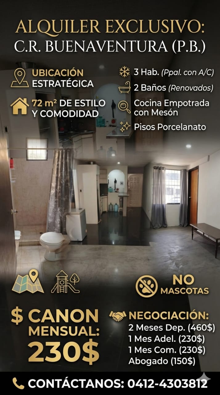 Se alquila apartamento en el Conjunto Residencial Buenaventura, ubicado en planta baja y con una superficie de 72 Mts². La propiedad cuenta con 3 habitaciones, destacando la principal por poseer aire acondicionado, y 2 baños completos. Los espacios internos incluyen una sala-comedor y una cocina empotrada con mesón, todo con acabados en piso de porcelanato. El inmueble dispone de un puesto de estacionamiento y el conjunto ofrece parque infantil para la recreación. Las condiciones de arrendamiento establecen un canon mensual de 230$ con una negociación que requiere 2 meses de depósito (460$) 1 mes de adelanto (230$) 1 mes de comisión (230$) y 150$ por gastos de redacción de abogado. Es importante señalar que no se aceptan mascotas. Para obtener más información, puede comunicarse al número 0412-430.38.12.