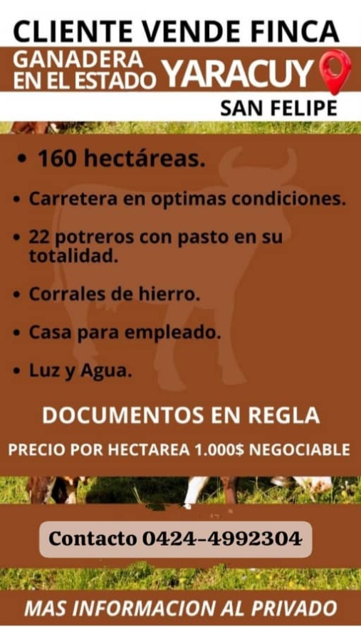 CLIENTE VENDE FINCA GANADERA EN EL ESTADO YARACUY, SAN FELIPE. Contáctanos para más detalles. Agente inmobiliario María Elena Medina B. 0424-499.23.04 WhatsApp.