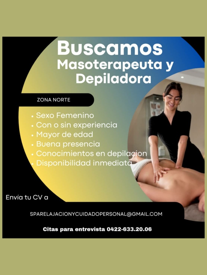 OFERTA DE EMPLEO. VALENCIA AV. BOLÍVAR. Se solicita MASOTERAPEUTA y DEPILADORA. Enviar CV al correo: sparelajacionycuidadopersonal@gmail.com Citas para entrevista al 0422-633.20.06.