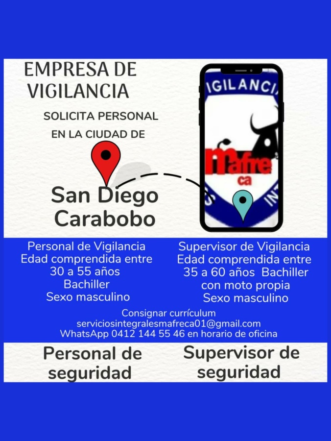 OFERTA DE EMPLEO. SAN DIEGO CARABOBO. Empresa de vigilancia solicita: PERSONAL DE SEGURIDAD. SUPERVISOR DE SEGURIDAD. Interesados consignar Curriculum: serviciosintegralesmafreca01@gmail.com WhatsApp: 0412-144.55.46 EN HORARIO DE OFICINA