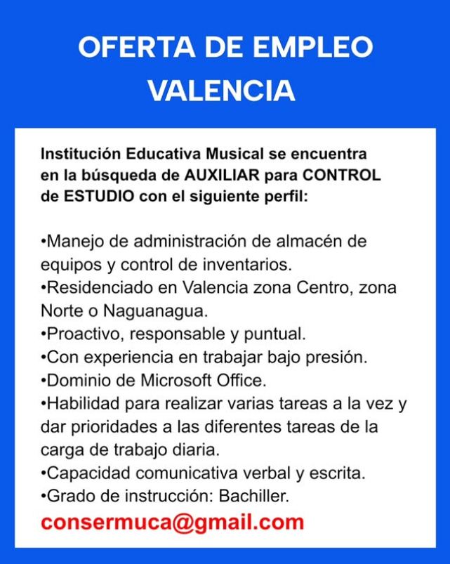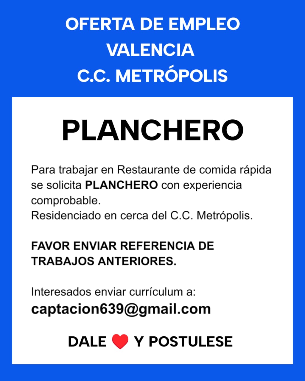 OFERTA DE EMPLEO VALENCIA. Aviso de Vacantes en Tender Box ¡Únete a nuestro equipo en Tender Box, ubicado en el Centro Comercial Metrópolis, nivel Feria! Estamos en búsqueda de talentos jóvenes para los siguientes puestos: Vendedores y Atención al Cliente: Buscamos personas dinámicas, activas, con capacidad para cumplir procesos y normativas. Se valorará experiencia en ventas y manejo de situaciones rápidas. Ayudante de Cocina: Requerimos personal con o sin experiencia en cocina y conocimiento en procesos y normativas. Importante No postular si resides en zonas alejadas del Centro Comercial Metrópolis, como Los Guayos, Zona Norte, Naguanagua, San Diego o Guacara. Interesados, envíen su currículum al WhatsApp: 0424-450.27.37. ¡Esperamos contar contigo!