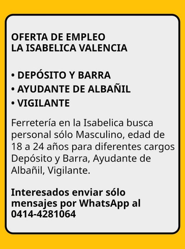 OFERTA DE EMPLEO. NAGUANAGUA CARABOBO.