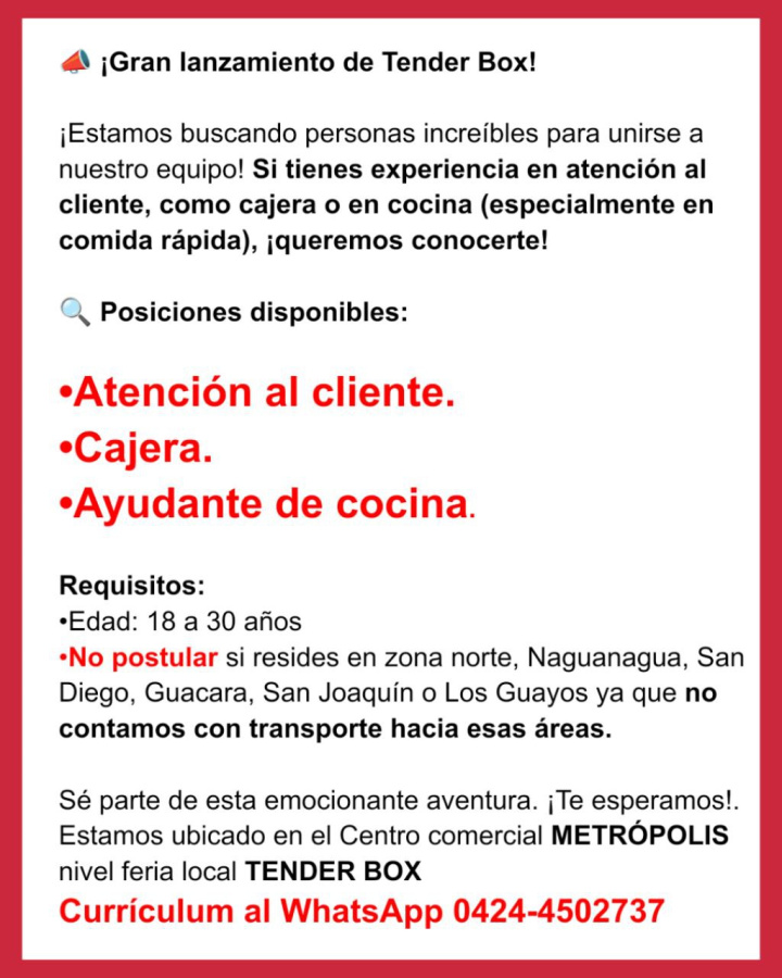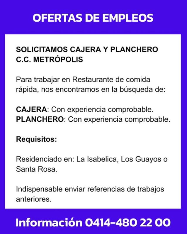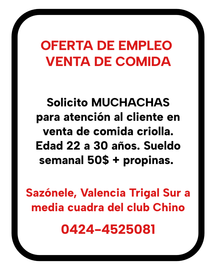 OFERTA DE EMPLEO VALENCIA. Solicito MUCHACHAS para atención al cliente en venta de comida criolla. Edad 22 a 30 años. Vendemos Sopas Cachapas, Cochino frito, Parrilla, etc. Trabajamos TODOS LOS DÍAS, libra un día a la semana de Lunes a Jueves, cualquier día de esos, No se libra ni Viernes ni Sábado mucho menos Domingo ya que son los días más movidos y es un fin de semana, se trabaja con volumen de clientes, sólo damos desayuno, al llegar deben limpiar, organizar el área, SE COLABORA EN TODO, el uso del TELÉFONO ESTÁ RESTRINGIDO. Pagamos 50$ semanal y adicional propina. Estamos ubicados en la urbanización Trigal Sur a media cuadra del club Chino. Sazónele. Preguntar por Elena o Rodolfo. Horario de 7:30 am a 4:30 pm de Lunes a Viernes y los Sábados y domingos hasta las 5:30 pm. Muy importante los pagos son en BOLÍVARES a la tasa del BCV. Contacto 0424-452.50.81