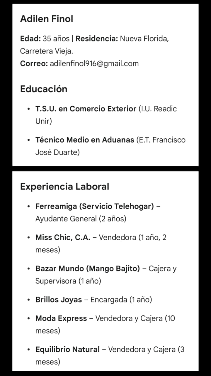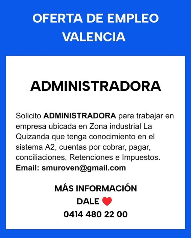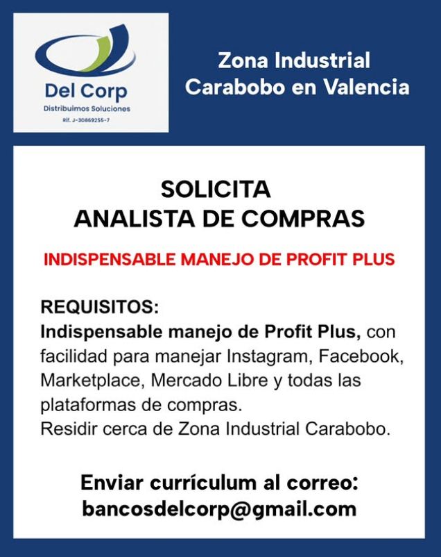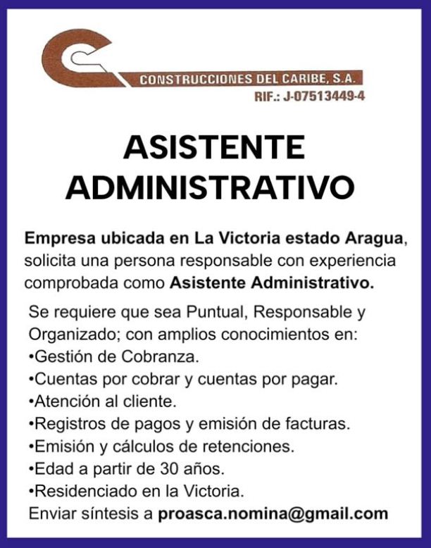 OFERTA DE EMPLEO. VALENCIA. MULTILAC Solicita ASISTENTE DE COBRANZA. Edad: mayor de 35. Sexo: Femenino. Estudios: TSU en administración, carrera a fin. Excel Intermedio INDISPENSABLE. Residenciado en Valencia, Guayos, Guacara. Proactiva. Fácil comunicación para interactuar con clientes y vendedores. Manejo sistema Profit u otro similar. Habilidad para el análisis e interpretación de datos. Beneficios: Salario en Bs. equivalente al tiempo medio o completo + cesta ticket + bono de transporte + bono por resultados a partir del 4 mes. Buen ambiente de trabajo. Envía tu CV al correo: administracion@multilac.com.ve