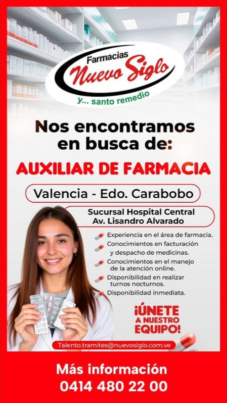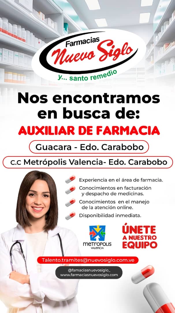 OFERTA DE EMPLEO. VALENCIA. En FARMACIAS NUEVO SIGLO Nos encontramos en busca de: AUXILIAR DE FARMACIA, para trabajar en Valencia - Edo. Carabobo. Sucursal Hospital Central - Av. Lisandro Alvarado. Con experiencia en el área de farmacia. Conocimientos en facturación y despacho de medicinas. Conocimientos en el manejo de la atención online. Disponibilidad en realizar turnos nocturnos. Disponibilidad inmediata. ¡ÚNETE A NUESTRO EQUIPO! talento.tramites@nuevosiglo.com.ve @farmaciasnuevosiglo_ www.farmaciasnuevosiglo.com