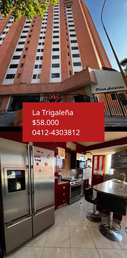 SUBRANCA ofrece en venta apartamento, en un lugar de privilegio: Urb. Trigaleña. Edificio: Plaza Asturias. 93 Mts², Piso 13, ascensor, cocina empotrada concepto abierto, desayunador con tope de granito, 3 habitaciones con sus clóset, 2 baños con paredouche, lavandero, piso de cerámica. Deja: Aires acondicionados(4), calentador. PLUS: Cerca de centros comerciales, Farmatodo, bomba de gasolina, supermercados, agencias bancarias. Precio $58.000. Más información contactarnos a través del 0412-430.38.12.