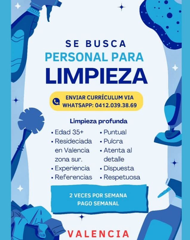 OFERTA DE EMPLEO VALENCIA. Nos encontramos en la búsqueda de: PERSONAL DE MANTENIMIENTO. El aspirante al cargo debe cumplir con los siguientes requisitos: Edad mayor de 40 años. Con Residencia en Valencia/Naguanagua. Alto sentido de Responsabilidad. Debe poseer Certificado Médico Sanitario Vigente (Emitido por INSALUD) Experiencia comprobable en labores de mantenimiento de oficina y áreas operativas (limitativo) Disponibilidad inmediata. De cumplir todos los requisitos postularse al correo: postulaciones.drog@gmail.com Debe indicar el cargo al cual se postula.