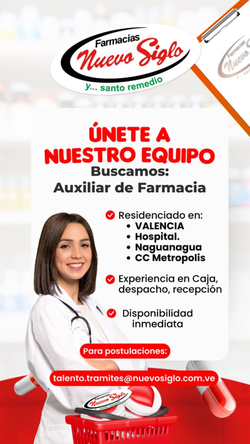 OFERTA DE EMPLEO. VALENCIA. Nos encontramos en la búsqueda de los siguientes perfiles: SUPERVISOR DE LOGÍSTICA, SEGURIDAD E INFRAESTRUCTURA + 40 años. ANALISTA DE COMERCIALIZACIÓN Y MERCADEO + 30 años. REGENTE FARMACÉUTICO + 40 años. SUPERVISOR DE ALMACÉN + 35 años. ALMACENISTAS + 25 años. FACTURACION + 25 años. PERSONAL DE VENTAS + 30 años. PERSONAL DE SEGURIDAD + 40 años. OPERARIOS DE MANTENIMIENTO + 35 años. Requisitos exigidos: Edades señaladas (Limitativo) Con residencia en el territorio Carabobo. Poseer grado de instrucción y formación acorde al cargo. Disponibilidad inmediata. Certificado Médico Sanitario vigente (Emitido por INSALUD) Experiencia comprobable en el cargo. Si cumples con todos los requisitos te invitamos a presentar tu postulación al siguiente correo: postulaciones.drog@gmail.com Debe indicar cargo al que se postula y grado de instrucción