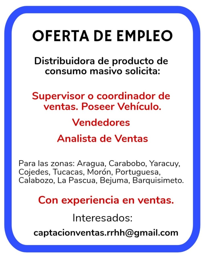 OFERTA DE EMPLEO. Distribuidora de producto de consumo masivo solicita: Supervisor o coordinador de ventas (Vehículo) Vendedores. Analista de Ventas. Para las zonas: Aragua, Carabobo, Yaracuy, Cojedes, Tucacas, Morón, Portuguesa, Calabozo, La Pascua, Bejuma, Barquisimeto. Con experiencia en ventas. Interesados: captacionventas.rrhh@gmail.com