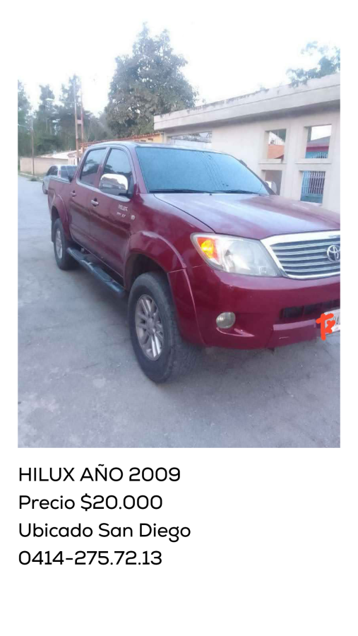 En venta Toyota Hilux, año 2009, 4 cilindros, automático, 4x2, 220.000 Kms, full aire acondicionado. Precio: 20.000$. Interesados contactar a través del +58 414-275.72.13.