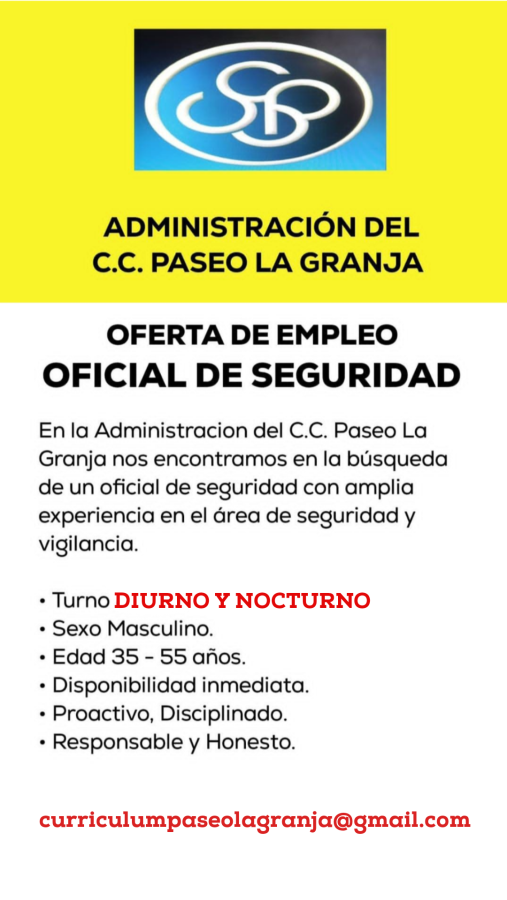 OFERTA DE EMPLEOS. NAGUANAGUA - CARABOBO. Se solicita OFICIAL DE SEGURIDAD. Interesados enviar su curriculum al correo electrónico: curriculumpaseolagranja@gmail.com
