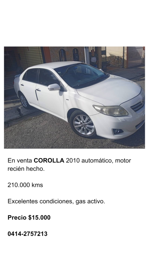 En venta TOYOTA COROLLA, año 2010, automático, motor recién hecho. 210.000 Kms. Excelentes condiciones, gas activo. Precio $15.000. Contacto 0414-275.72.13.