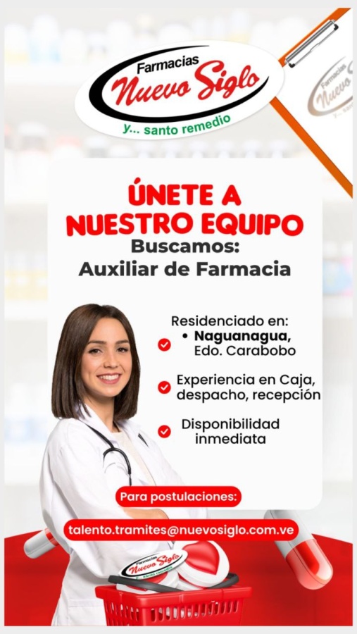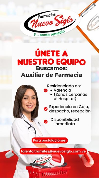 OFERTA DE EMPLEO. VALENCIA. ÚNETE A NUESTRO EQUIPO. Buscamos: AUXILIAR DE FARMACIA. Residenciado en: Valencia, Edo. Carabobo (zonas cercanas al Hospital). Experiencia en caja, despacho, recepción. Disponibilidad inmediata. Para postulaciones: talento.tramites@nuevosiglo.com.ve