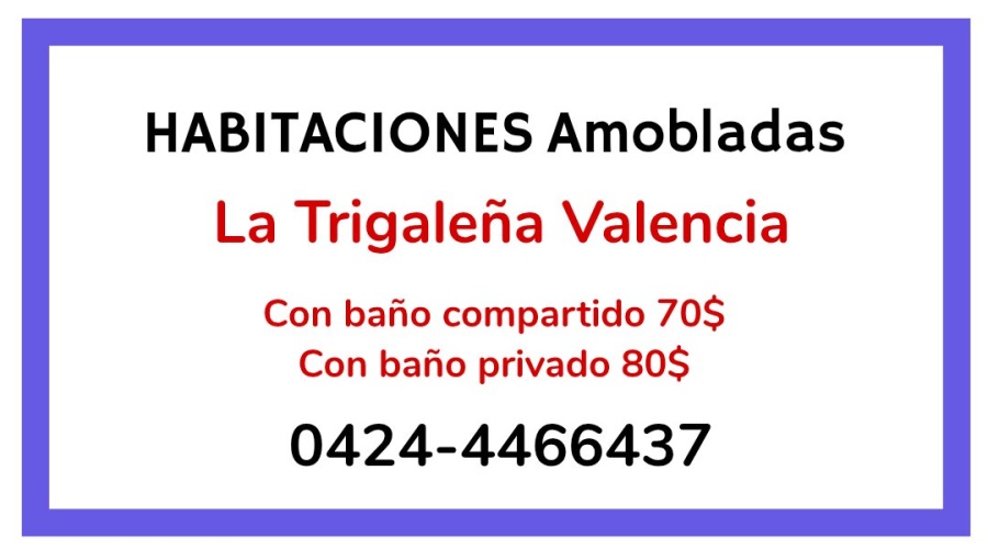 HABITACIONES Tengo 3 habitaciones amobladas para damas en La Trigaleña. 2 con baño compartido a 70$ Otra con baño privado en 80$. Contacto WhatsApp +58 424-446.64.37.