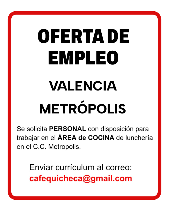 OFERTA DE EMPLEO. C.C. METRÓPOLIS VALENCIA. Se solicita PERSONAL con disposición para trabajar en el ÁREA de COCINA de lunchería en el C.C. Metropolis. Enviar currículum al correo: cafequicheca@gmail.com