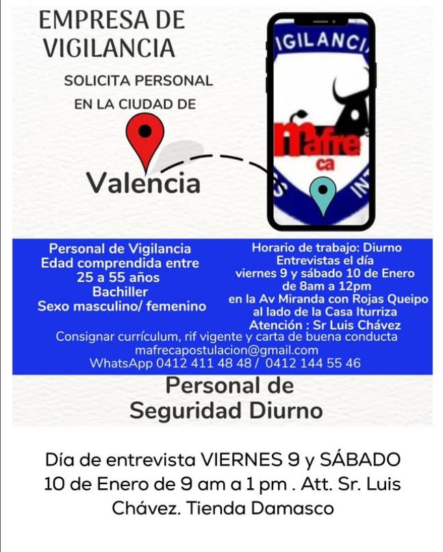 OFERTA DE EMPLEO. PARAPARAL LOS GUAYOS. MONTO SEGURIDAD, C.A. Solicita PERSONAL MASCULINO como OFICIAL de SEGURIDAD. Para la zona de Paraparal LOS GUAYOS, Carabobo Venezuela. Con edades comprendidasdesde los 35 a 65 años. Debe enviar su currículum por Whatsapp y llamar a los números: 0412-013 96.77, 0412-250.74.58.