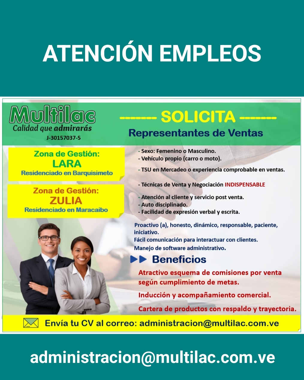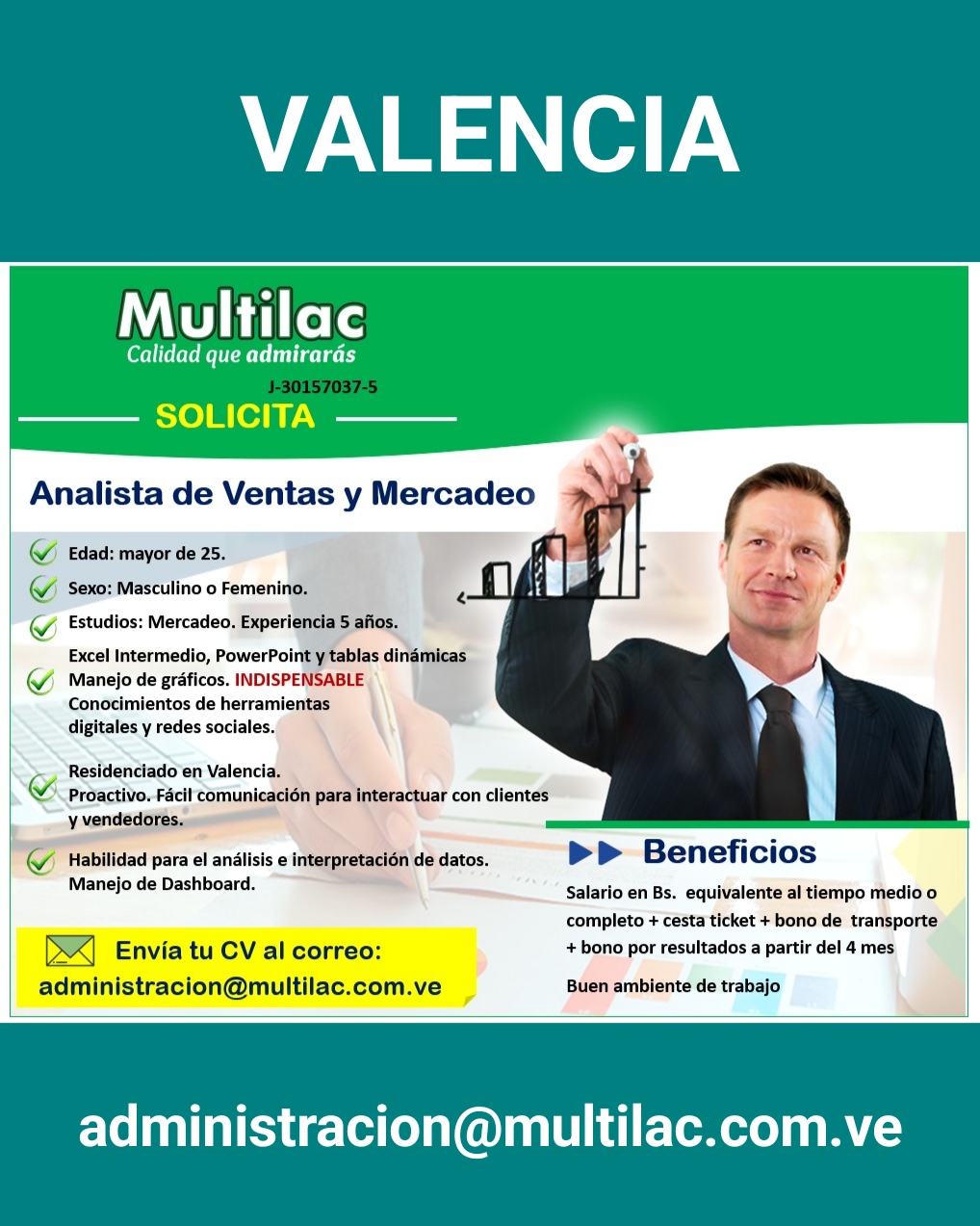 OFERTA DE EMPLEO. VALENCIA. MULTILAC Solicita ASISTENTE DE COBRANZA. Edad: mayor de 35. Sexo: Femenino. Estudios: TSU en administración, carrera a fin. Excel Intermedio INDISPENSABLE. Residenciado en Valencia, Guayos, Guacara. Proactiva. Fácil comunicación para interactuar con clientes y vendedores. Manejo sistema Profit u otro similar. Habilidad para el análisis e interpretación de datos. Beneficios: Salario en Bs. equivalente al tiempo medio o completo + cesta ticket + bono de transporte + bono por resultados a partir del 4 mes. Buen ambiente de trabajo. Envía tu CV al correo: administracion@multilac.com.ve