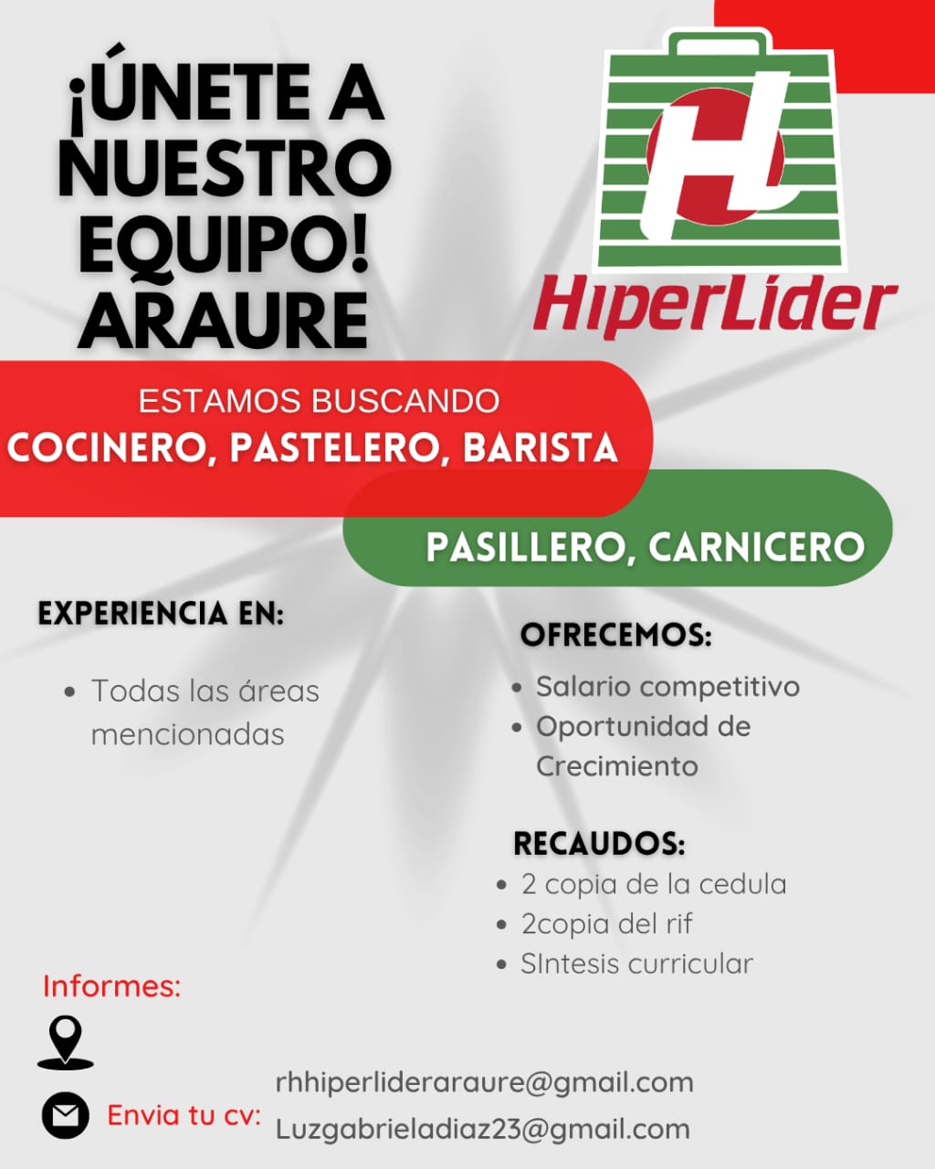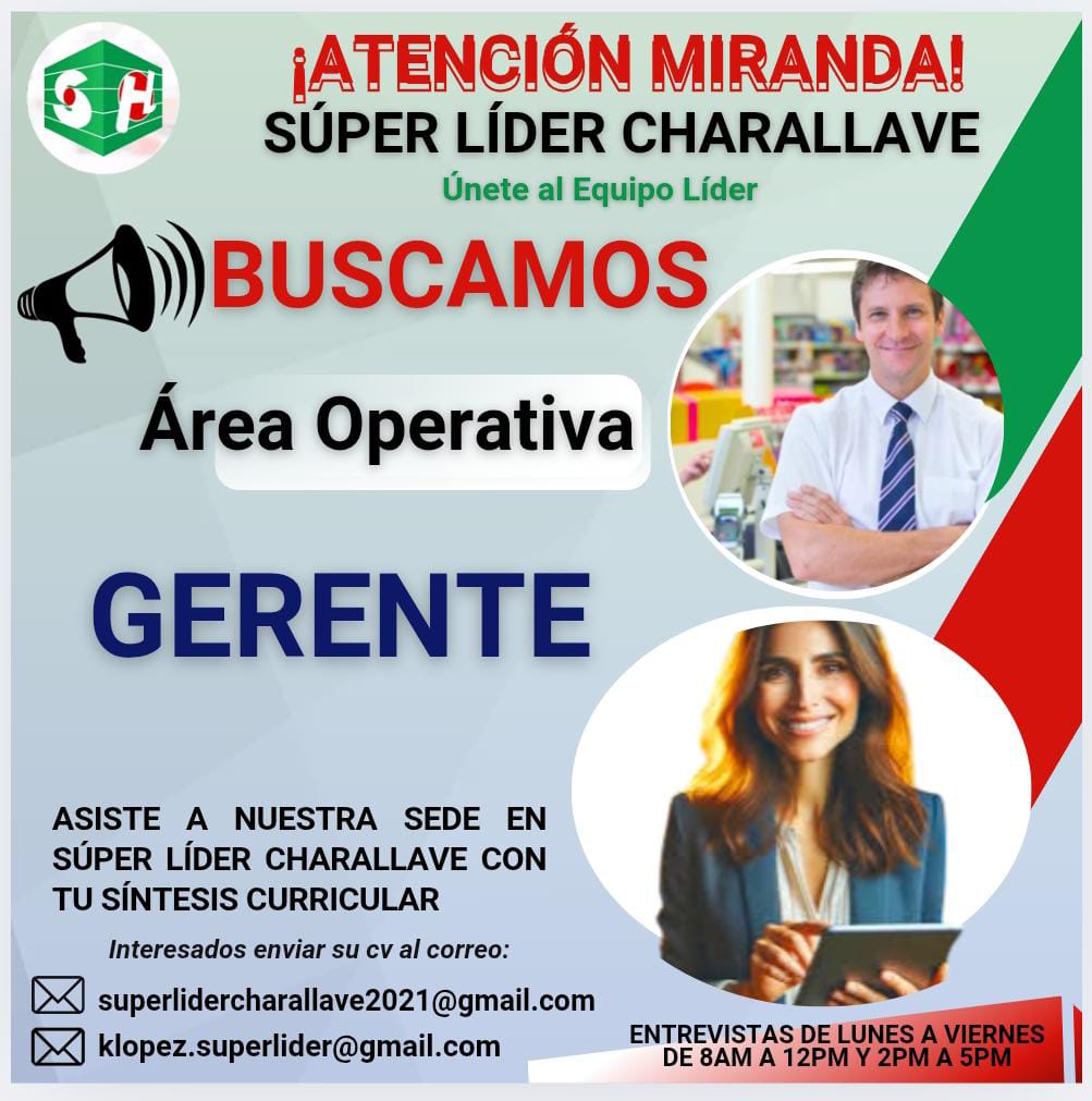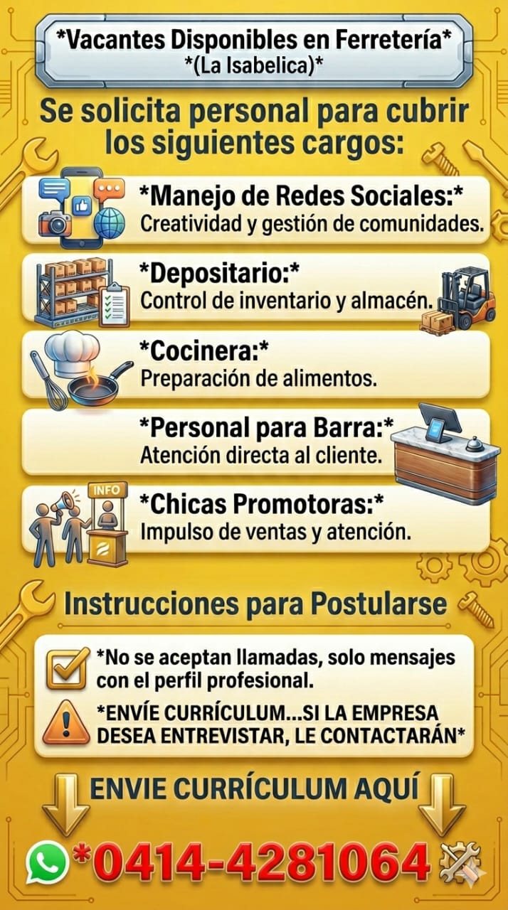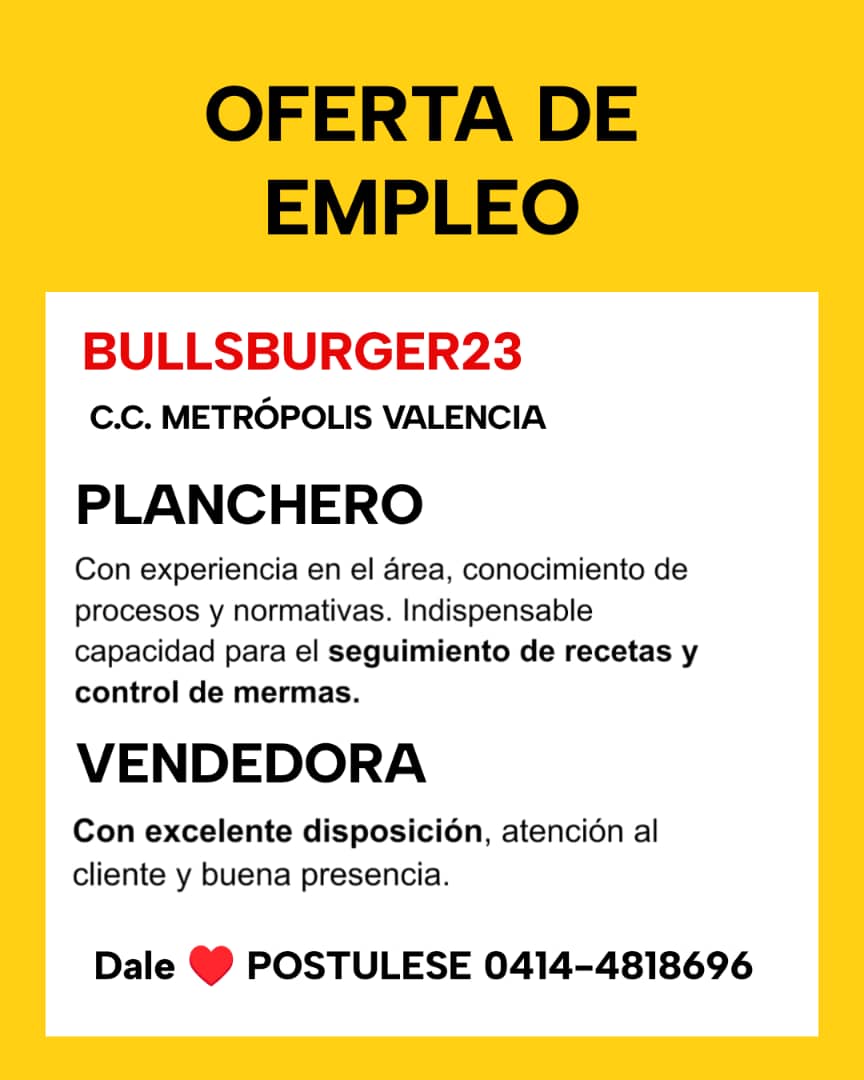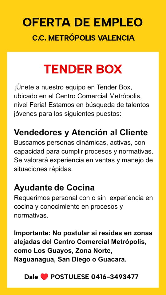 OFERTA DE EMPLEO VALENCIA. Aviso de Vacantes en Tender Box ¡Únete a nuestro equipo en Tender Box, ubicado en el Centro Comercial Metrópolis, nivel Feria! Estamos en búsqueda de talentos jóvenes para los siguientes puestos: Vendedores y Atención al Cliente: Buscamos personas dinámicas, activas, con capacidad para cumplir procesos y normativas. Se valorará experiencia en ventas y manejo de situaciones rápidas. Ayudante de Cocina: Requerimos personal con o sin experiencia en cocina y conocimiento en procesos y normativas. Importante No postular si resides en zonas alejadas del Centro Comercial Metrópolis, como Los Guayos, Zona Norte, Naguanagua, San Diego o Guacara. Interesados, envíen su currículum al WhatsApp: 0424-450.27.37. ¡Esperamos contar contigo!