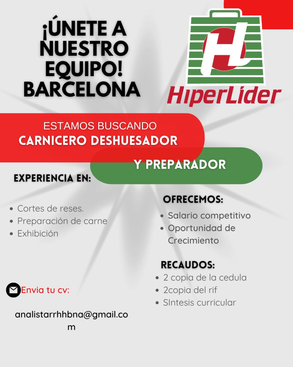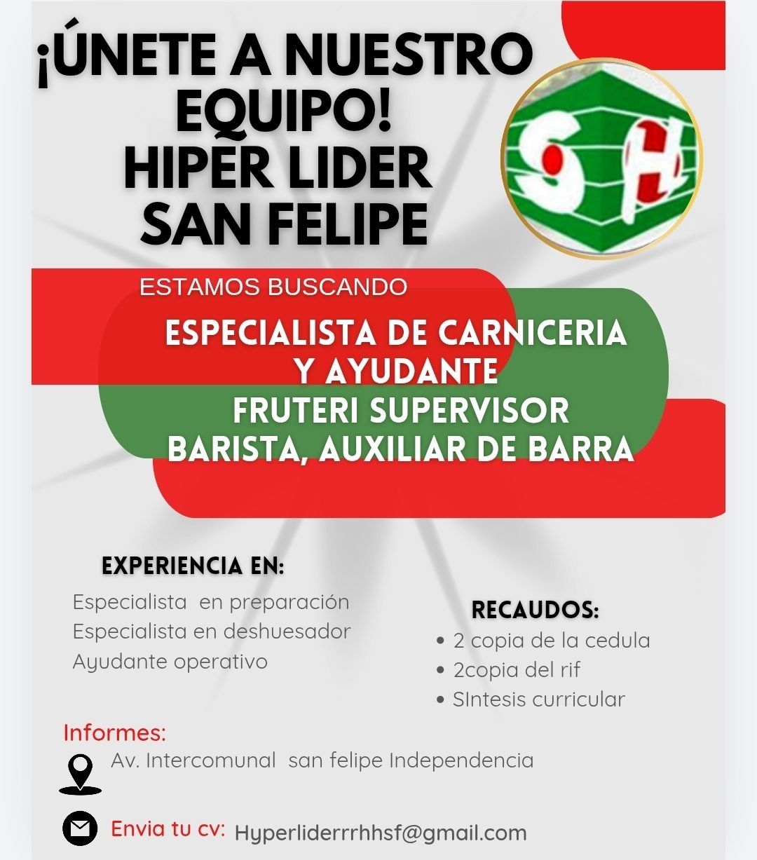 OFERTA DE EMPLEO VALENCIA ¡ÚNETE A NUESTRO EQUIPO! La Casa de la Barquilla está en la búsqueda de talento para formar parte de su equipo de trabajo. Vacantes Disponibles: Asistente administrativo. Asesores de ventas al mayor. Chofer. Operadores integrales de producción. Operador integral de almacén e inventario. Operador integral de finca. ¿Cómo postularse? Si cumples con el perfil y deseas formar parte de nuestra empresa, envía tu síntesis curricular actualizada al siguiente correo electrónico: barquilla.rrhh2026@gmail.com