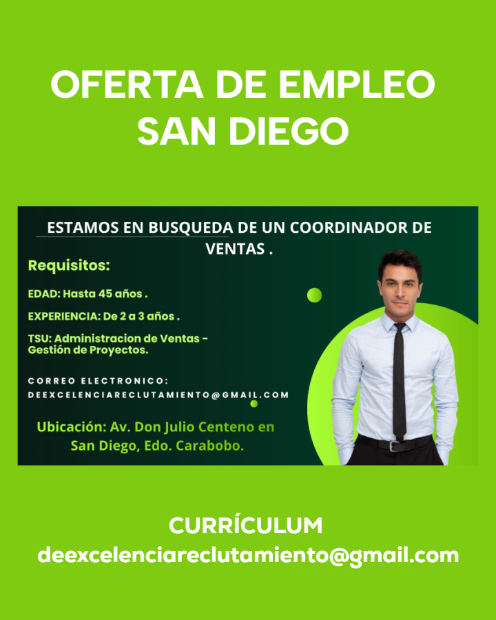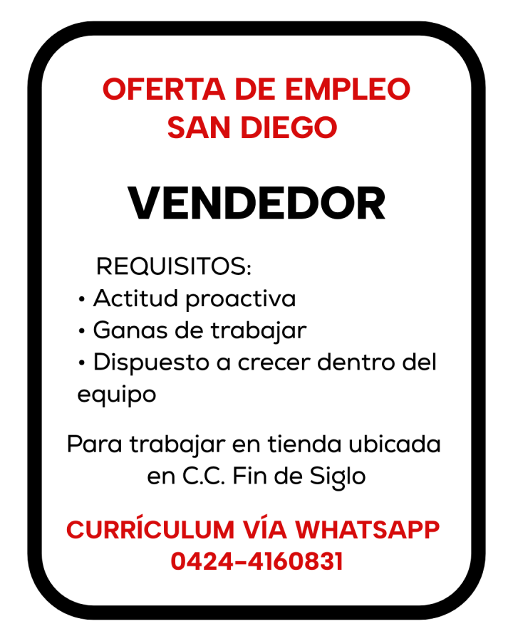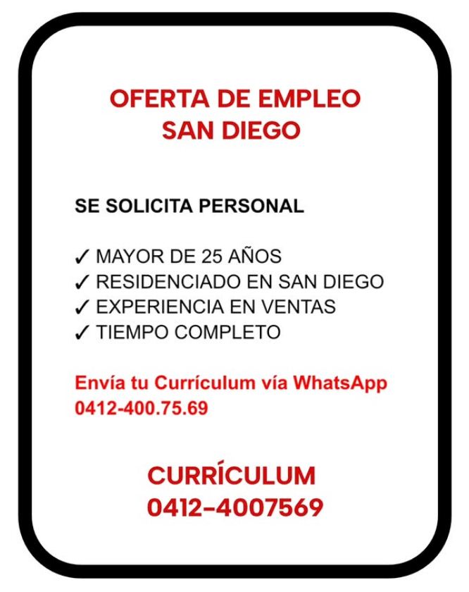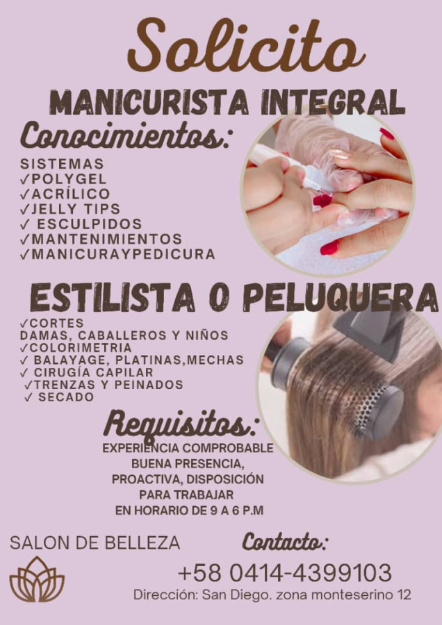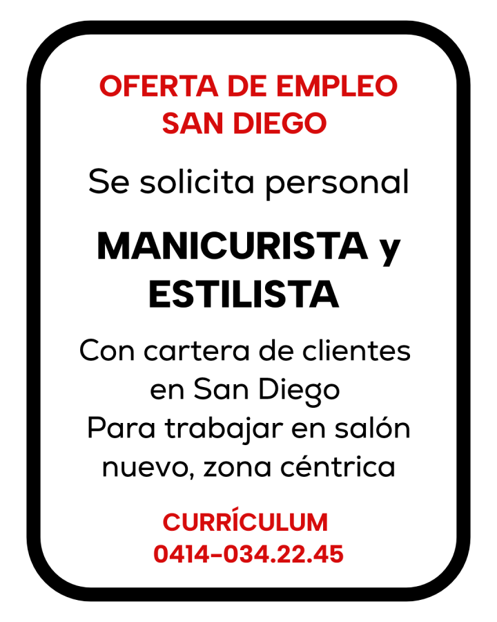 OFERTA DE EMPLEO SAN DIEGO. Se solicita personal MANICURISTA y ESTILISTA. Con cartera de clientes en San Diego para trabajar en salón nuevo, zona céntrica. WhatsApp 0414-034 22.45
