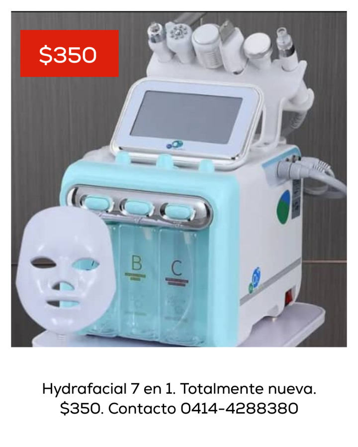 Este es un equipo de estética profesional que combina siete funciones diferentes para ofrecer un tratamiento facial completo e integral. La idea es limpiar, exfoliar, hidratar y rejuvenecer la piel en una sola sesión. Las 7 funciones principales aunque la configuración exacta puede variar ligeramente entre fabricantes, las 7 funciones más comunes de un Hydrafacial 7 en 1 son: Beneficios del Tratamiento. El uso combinado de estas tecnologías ofrece múltiples beneficios para casi todo tipo de piel: Limpieza Intensiva y Desintoxicación: Elimina la suciedad, grasa y células muertas de los poros. Hidratación Profunda: Infunde la piel con antioxidantes y sueros hidratantes. Rejuvenecimiento: Estimula el colágeno y la elastina para reducir líneas finas y arrugas. Mejora de Textura: Deja la piel más suave, luminosa y con un tono más uniforme. Ideal para el acné: Ayuda a regular el sebo y a limpiar los poros congestionados. No Invasivo: El procedimiento es indoloro y no requiere tiempo de recuperación. En resumen, el Hydrafacial 7 en 1 busca proporcionar un rostro más limpio, hidratado, firme y radiante en una sola sesión. Contáctenos al 0414-428.83.80.