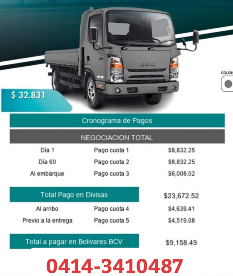 Se vende vehículo JAC ARENA, automático, año 2025, cero km, a facturar. Entrega inmediata a crédito 12 meses. Inicial: 10.192$ IVA: 3.238,20$ a BCV. 12 cuotas fijas de: 917,80$ 3 giros especiales en los meses 3 - 6 - 9 de: 1.672,20$ El precio incluye IVA. El precio incluye seguro a todo riesgo por un año. Vehículo con 6 años de garantía o 150 mil km. Entrega inmediata. Pregunte sin compromiso. Interesados comunicarse al 0414-341.04.87.