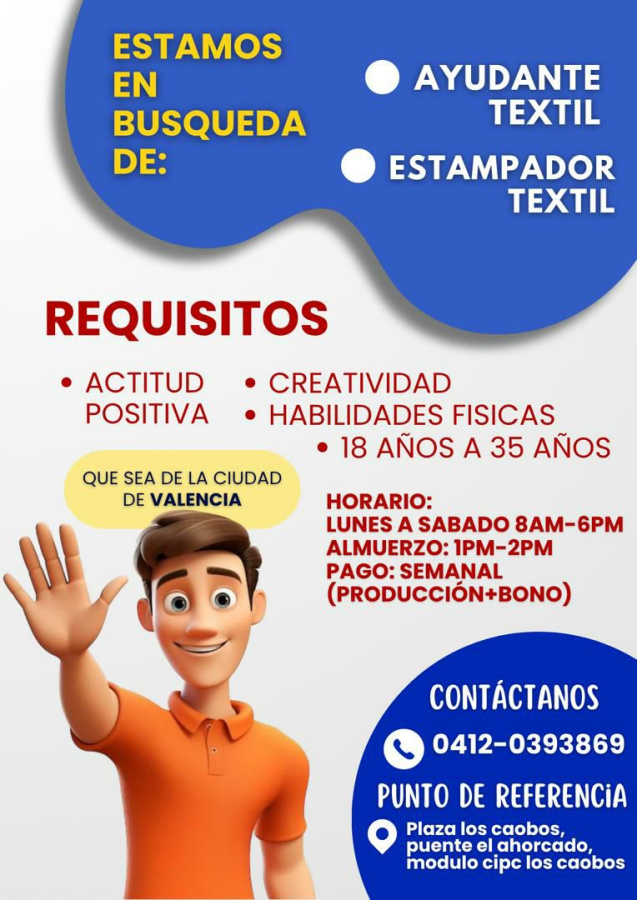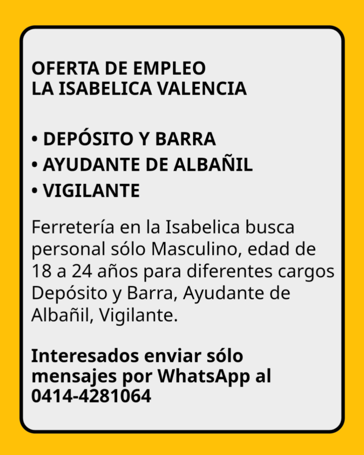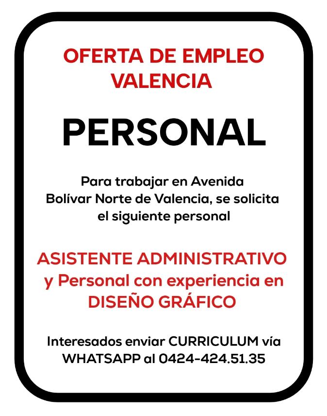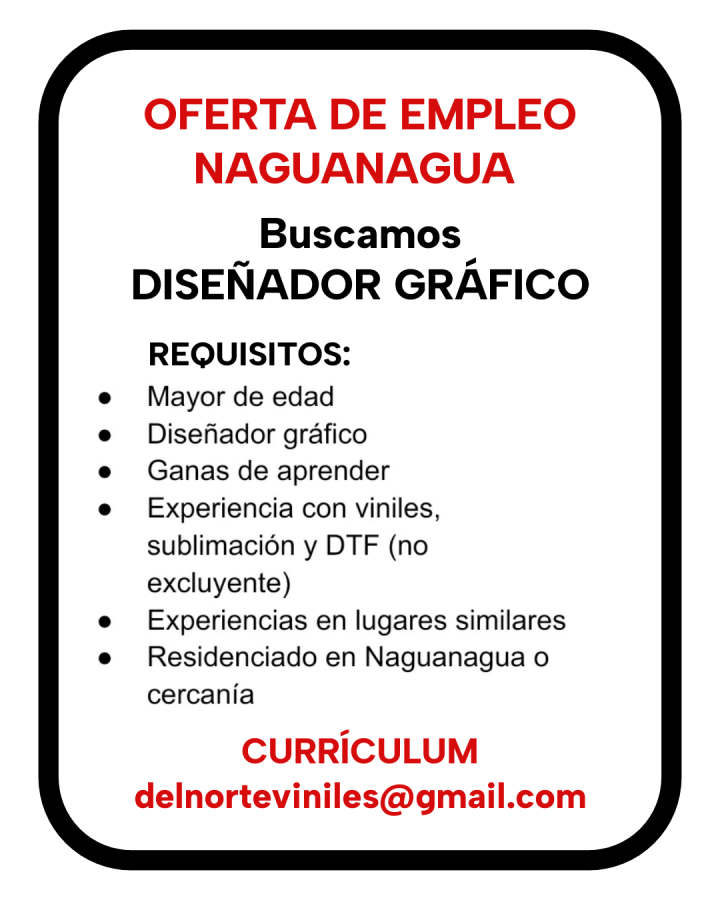 OFERTA DE EMPLEO C.C. LA GRANJA NAGUANAGUA Para trabajar en VINILES DEL NORTE Buscamos DISEÑADOR GRÁFICO. PERFIL PROFESIONAL: Mayor de edad. Diseñador gráfico. Ganas de aprender. Experiencia con viniles, sublimación y DTF (no excluyente) Experiencias en lugares similares. Residenciado en Naguanagua o cercanía. ENVÍANOS TU CURRÍCULUM A DELNORTEVINILES@GMAIL.COM