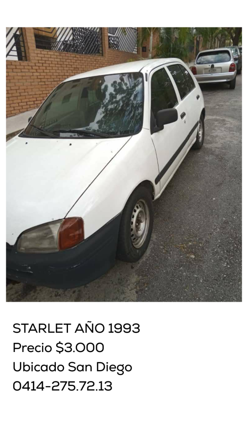 Se vende TOYOTA STARLET, año 1993, automático. Precio $3.000 negociable. Contacto 0414-275.72.13.