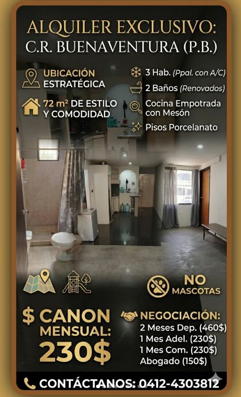 Se alquila apartamento en el Conjunto Residencial Buenaventura, ubicado en planta baja y con una superficie de 72 Mts². La propiedad cuenta con 3 habitaciones, destacando la principal por poseer aire acondicionado, y 2 baños completos. Los espacios internos incluyen una sala-comedor y una cocina empotrada con mesón, todo con acabados en piso de porcelanato. El inmueble dispone de un puesto de estacionamiento y el conjunto ofrece parque infantil para la recreación. Las condiciones de arrendamiento establecen un canon mensual de 230$ con una negociación que requiere 2 meses de depósito (460$) 1 mes de adelanto (230$) 1 mes de comisión (230$) y 150$ por gastos de redacción de abogado. Es importante señalar que no se aceptan mascotas. Para obtener más información, puede comunicarse al número 0412-430.38.12.