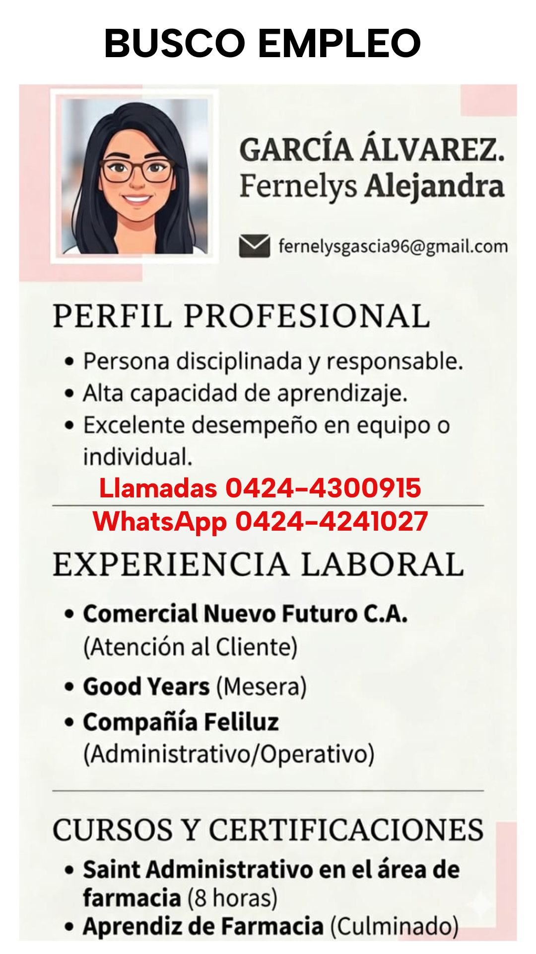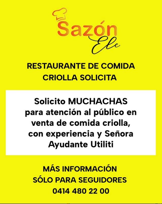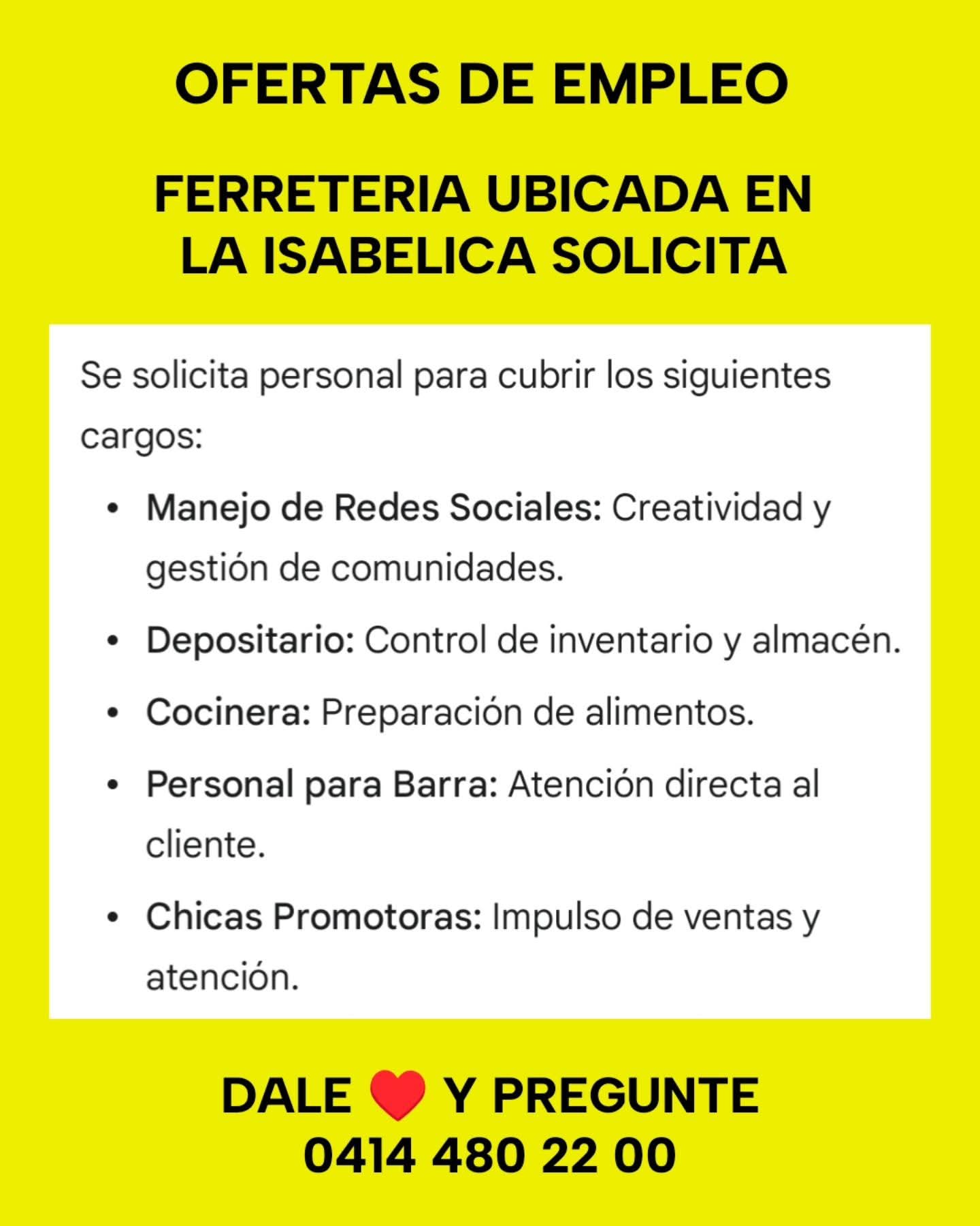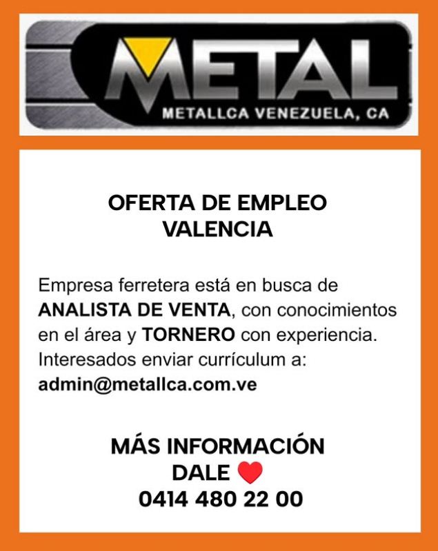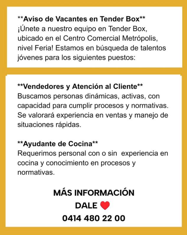 OFERTA DE EMPLEO VALENCIA. Aviso de Vacantes en Tender Box ¡Únete a nuestro equipo en Tender Box, ubicado en el Centro Comercial Metrópolis, nivel Feria! Estamos en búsqueda de talentos jóvenes para los siguientes puestos: Vendedores y Atención al Cliente: Buscamos personas dinámicas, activas, con capacidad para cumplir procesos y normativas. Se valorará experiencia en ventas y manejo de situaciones rápidas. Ayudante de Cocina: Requerimos personal con o sin experiencia en cocina y conocimiento en procesos y normativas. Importante No postular si resides en zonas alejadas del Centro Comercial Metrópolis, como Los Guayos, Zona Norte, Naguanagua, San Diego o Guacara. Interesados, envíen su currículum al WhatsApp: 0424-450.27.37. ¡Esperamos contar contigo!