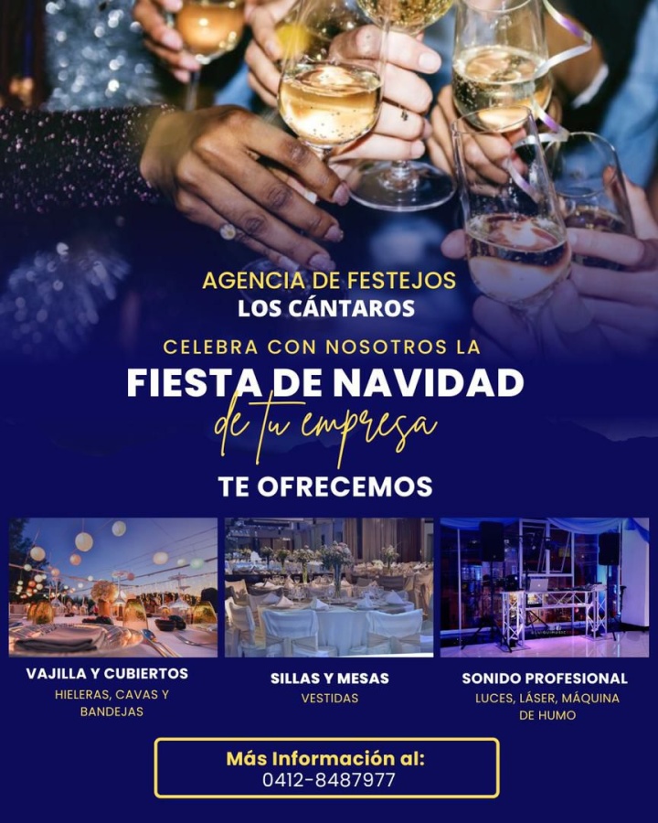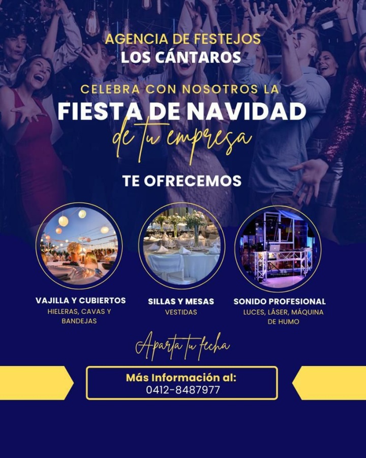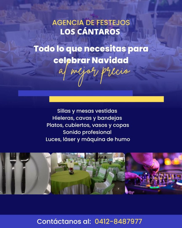 Agencia de Festejos Los Cántaros tenemos todo lo que necesita para celebrar su fiesta en estas navidades: sillas, mesas, mesones, platos, vasos, cubiertos, copas, sonido profesional, luces, láser y máquina de humo. Contáctanos a través del 0412-848.79.77.