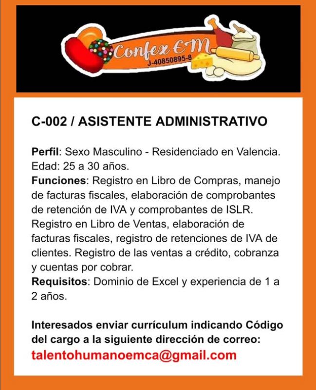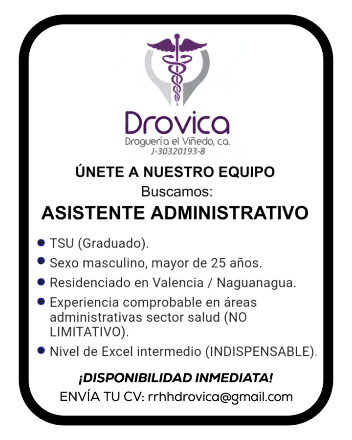 OFERTA DE EMPLEO. VALENCIA. Se solicita ASISTENTE ADMINISTRATIVO. Requisitos: Personal Masculino. Mayor de 25 Años. TSU Mínimo. Experiencia en labores administrativas (Comprobable) Experiencia como supervisor de Call Center. Buen léxico, para la atención de clientes vía telefónica (Limitativo) Dominio de programa Excel: formato de hoja de Ruta, diseño de gráficas, fórmulas, tablas dinámicas (Demostrable-Limitativo) Manejo de Profit Plus (Deseable) Alto sentido de responsabilidad. Capacidad de priorizar actividades diarias cumpliendo con lo asignado. Habilidad para trabajar en equipo. Disponibilidad inmediata. Interesados enviar síntesis curricular al: postulaciones.drog@gmail.com Indicar cargo al cual se postula.