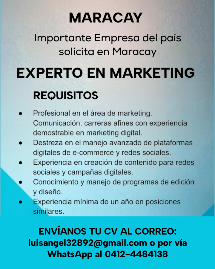 OFERTA DE EMPLEO. MARACAY. Importante Empresa del país solicita en Maracay: EXPERTO EN MARKETING. REQUISITOS: Profesional en el área de marketing. Comunicación, carreras afines con experiencia demostrable en marketing digital. Destreza en el manejo avanzado de plataformas digitales de e-commerce y redes sociales. Experiencia en creación de contenido para redes sociales y campañas digitales. Conocimiento y manejo de programas de edición y diseño. Experiencia mínima de un año en posiciones similares. ENVÍANOS TU CV AL CORREO: luisangel32892@gmail.com o por vía WhatsApp al 0412-448.41.38