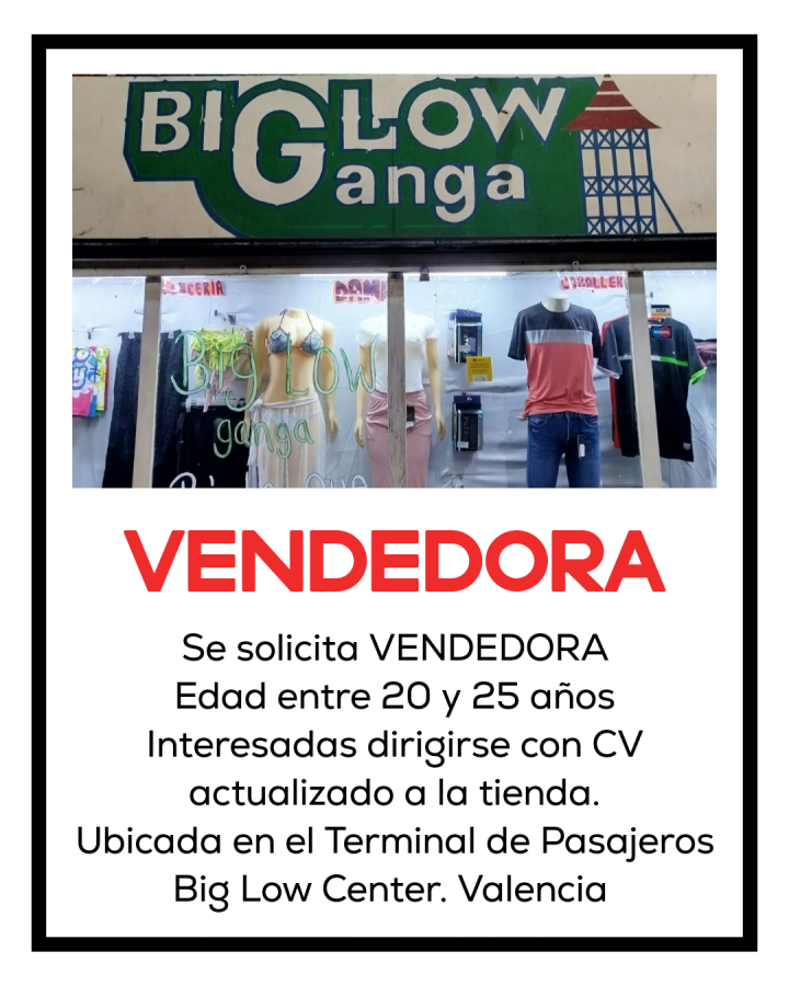 OFERTA DE EMPLEO. TERMINAL DE PASAJEROS BIG LOW CENTER. VENDEDORA. Edad comprendida entre 20 y 25 años. Interesadas dirigirse con CV actualizado a la tienda ubicada en el Terminal de pasajeros del Big Low Center.
