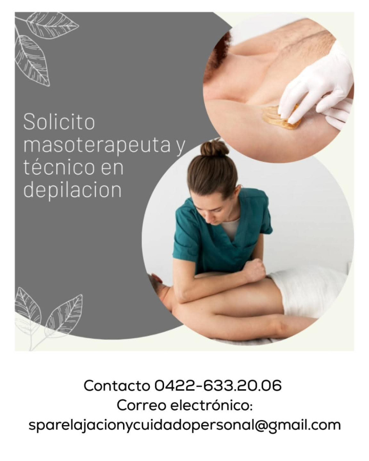 OFERTA DE EMPLEO. Solicito masoterapeuta y técnico en depilación mayor de edad, responsable, excelente presencia, con disponibilidad inmediata para trabajar en centro Estético. Contacto 0422-633.20.06. Correo electrónico: sparelajacionycuidadopersonal@gmail.com