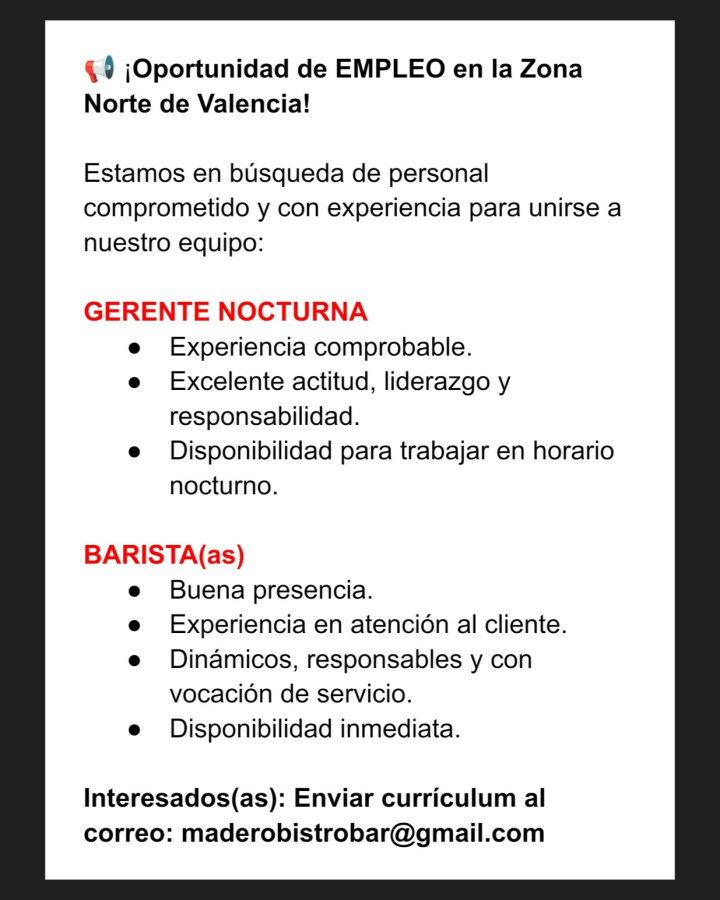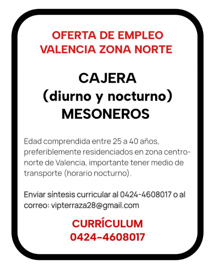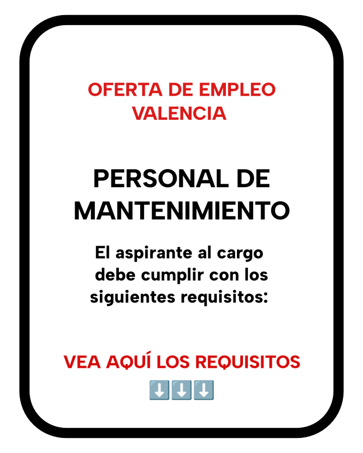 OFERTA DE EMPLEO VALENCIA. Nos encontramos en la búsqueda de: PERSONAL DE MANTENIMIENTO. El aspirante al cargo debe cumplir con los siguientes requisitos: Edad mayor de 40 años. Con Residencia en Valencia/Naguanagua. Alto sentido de Responsabilidad. Debe poseer Certificado Médico Sanitario Vigente (Emitido por INSALUD) Experiencia comprobable en labores de mantenimiento de oficina y áreas operativas (limitativo) Disponibilidad inmediata. De cumplir todos los requisitos postularse al correo: postulaciones.drog@gmail.com Debe indicar el cargo al cual se postula.