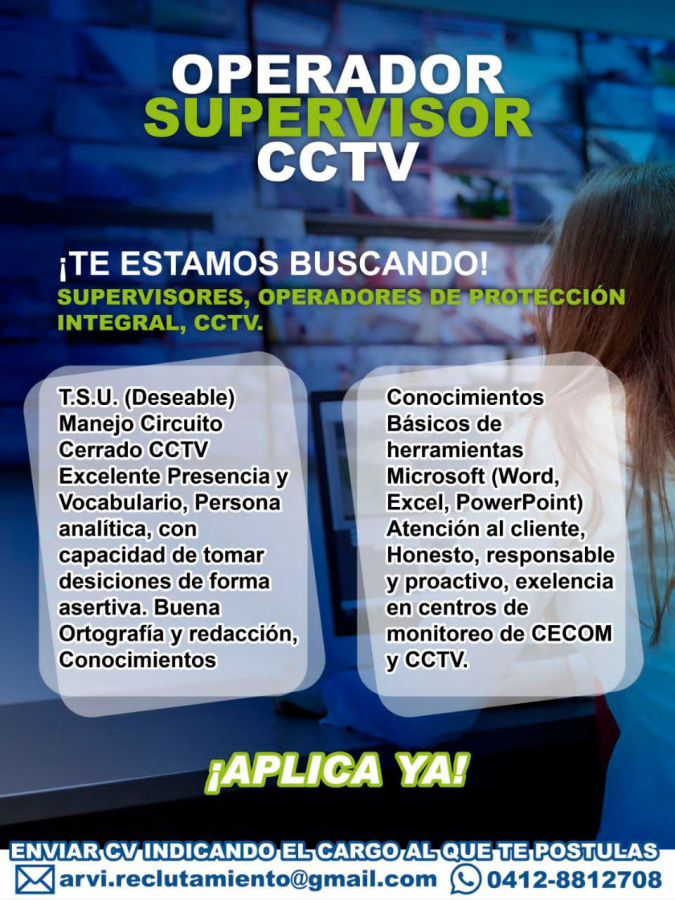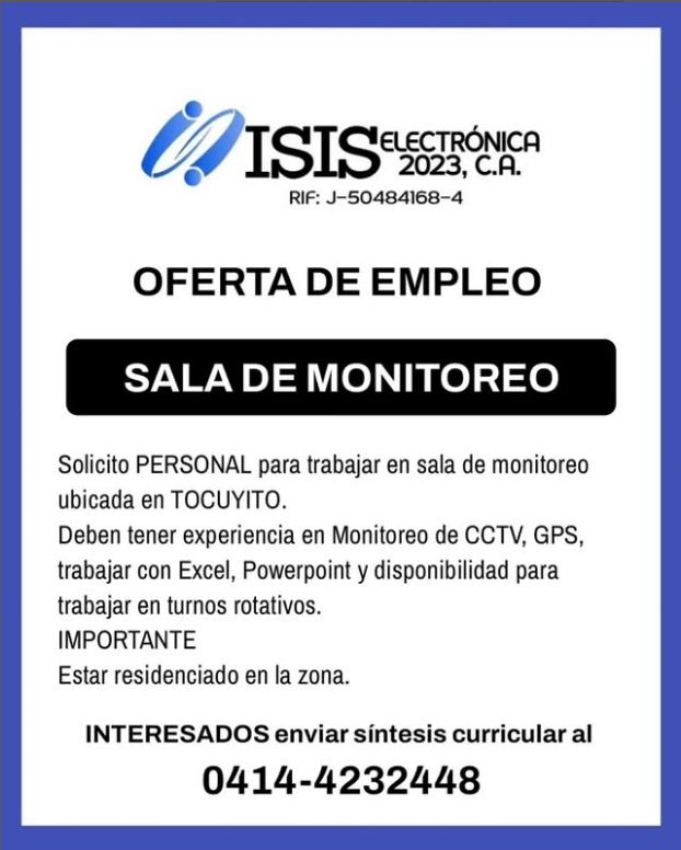 OFERTA DE EMPLEO. TOCUYITO Edo. CARABOBO. SALA DE MONITOREO. Solicito PERSONAL para trabajar en sala de monitoreo ubicada en TOCUYITO. Deben tener experiencia en Monitoreo de CCTV, GPS, trabajar con Excel, Powerpoint y disponibilidad para trabajar en turnos rotativos. IMPORTANTE: Estar residenciado en la zona. INTERESADOS enviar síntesis curricular al 0414-423.24.48