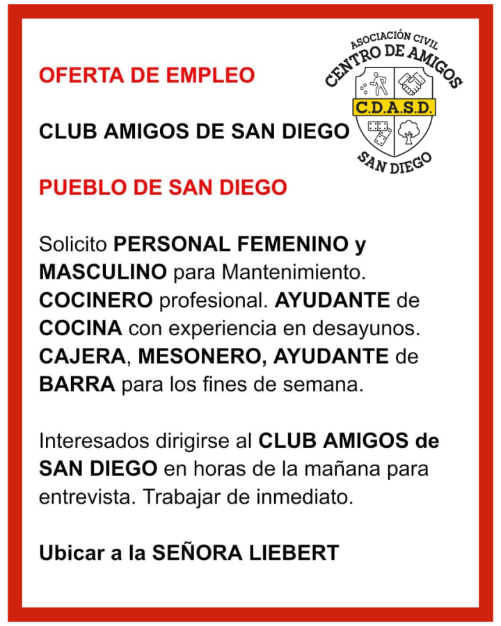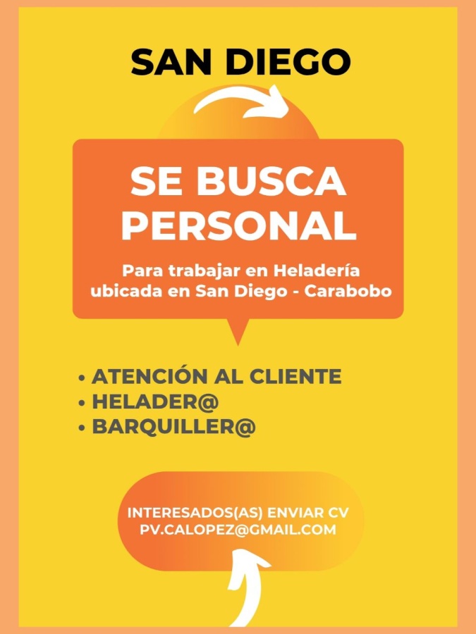 OFERTA DE EMPLEO SAN DIEGO. Para trabajar en Heladería ubicada en San Diego se solicita personal: ATENCIÓN AL CLIENTE. HELADER@. BARQUILLER@. INDISPENSABLE: Vivir en el Pueblo de San Diego, El Remanso o zonas aledañas. Interesados(as) enviar currículum al correo electrónico: pv.calopez@gmail.com