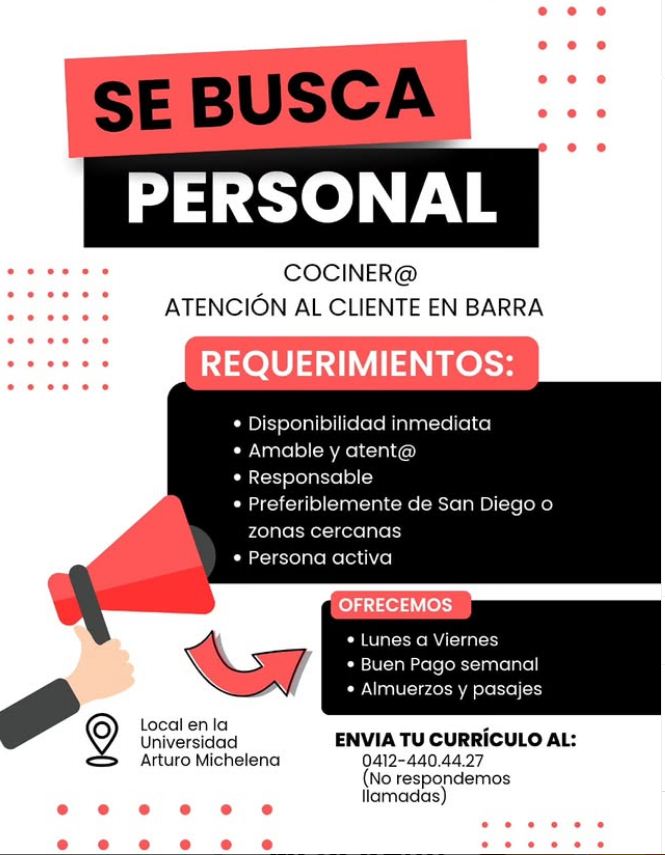 OFERTA DE EMPLEO. SAN DIEGO CARABOBO. Se solicita Cocinero(a), Atención al cliente en barra. Para trabajar en local ubicado dentro de la universidad Arturo Michelena - San Diego Carabobo. Interesados enviar CV vía WhatsApp al 0412-440.44.27 (No atendemos llamadas)