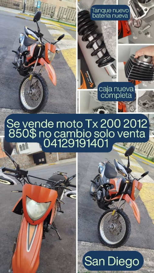 Se vende Moto Keeway TX 200 año 2012. En perfecto estado, tanque nuevo, carburador nuevo, batería nueva, caja nueva recién cambiada con todos sus repuestos. Papeles en regla. Fácil traspaso de dueño directo. Sólo vendo NO CAMBIO. 850$. Ubicada en San Diego. Mensaje al WhatsApp 0412-919.14.01.