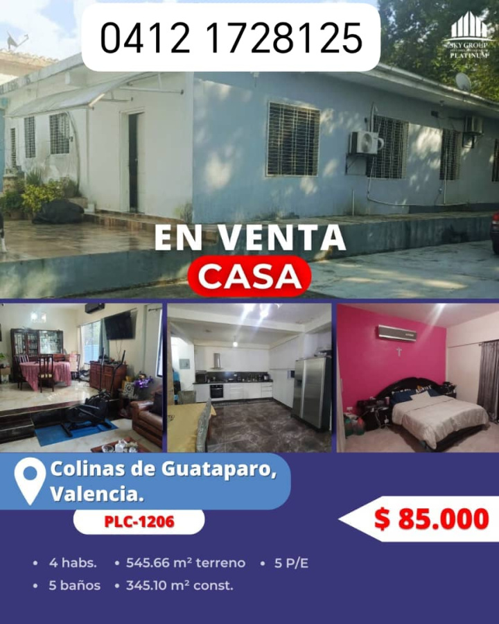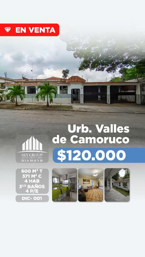 EN VENTA CASA, ubicada en urbanización VALLES DE CAMORUCO, Valencia Edo. Carabobo. 4 habitaciones, 3 ½ baños, 4 puestos de estacionamiento, 600 Mts² de terreno, 371 Mts² de construcción. Precio de oportunidad $120.000. Información al 0412-172.81.25 Nardy Meza