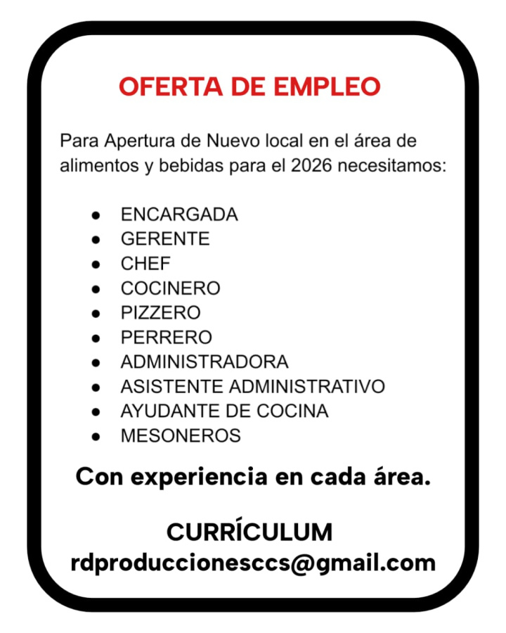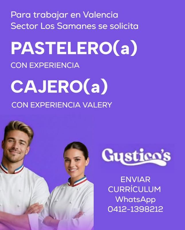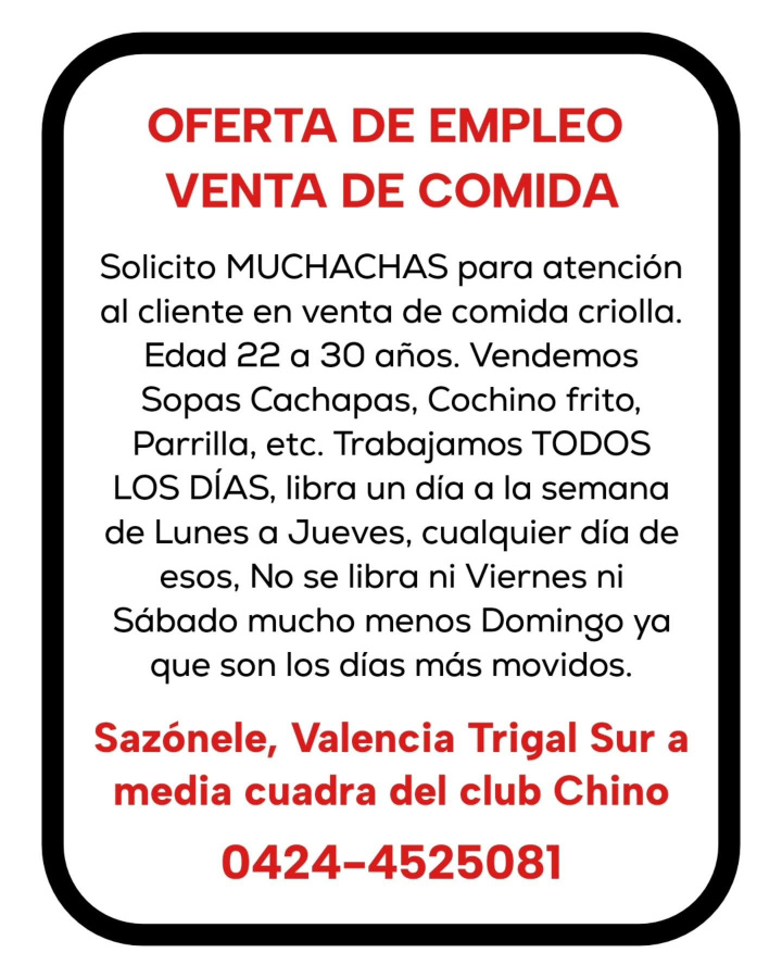 OFERTA DE EMPLEO VALENCIA. Solicito MUCHACHAS para atención al cliente en venta de comida criolla. Edad 22 a 30 años. Vendemos Sopas Cachapas, Cochino frito, Parrilla, etc. Trabajamos TODOS LOS DÍAS, libra un día a la semana de Lunes a Jueves, cualquier día de esos, No se libra ni Viernes ni Sábado mucho menos Domingo ya que son los días más movidos y es un fin de semana, se trabaja con volumen de clientes, sólo damos desayuno, al llegar deben limpiar, organizar el área, SE COLABORA EN TODO, el uso del TELÉFONO ESTÁ RESTRINGIDO. Pagamos 50$ semanal y adicional propina. Estamos ubicados en la urbanización Trigal Sur a media cuadra del club Chino. Sazónele. Preguntar por Elena o Rodolfo. Horario de 7:30 am a 4:30 pm de Lunes a Viernes y los Sábados y domingos hasta las 5:30 pm. Muy importante los pagos son en BOLÍVARES a la tasa del BCV. Contacto 0424-452.50.81