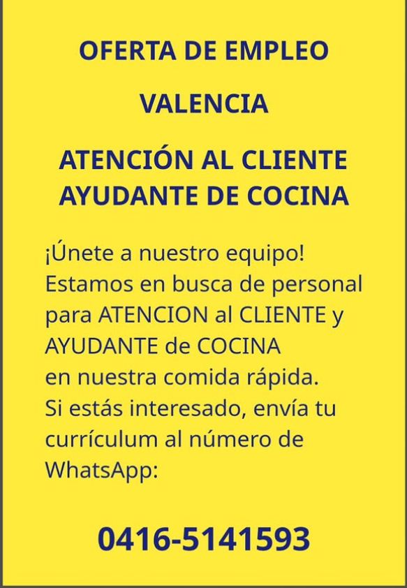 OFERTA DE EMPLEO. C.C. METRÓPOLIS VALENCIA. ¡Únete a nuestro equipo! Estamos en busca de personal para ATENCIÓN al CLIENTE y AYUDANTE de COCINA en nuestra comida rápida. Si estás interesado, envía tu currículum al número de WhatsApp: 0416-514.15.93. IMPORTANTE: No consideramos postulantes que residan en las zonas de Naguanagua, Guacara o el pueblo de San Diego, ya que no contamos con transporte para esas áreas. Horario: Hasta las 9:00 p.m. Ubicación: Centro Comercial Metrópolis, Nivel Sol (Feria de Comida) ¡Esperamos tu postulación!