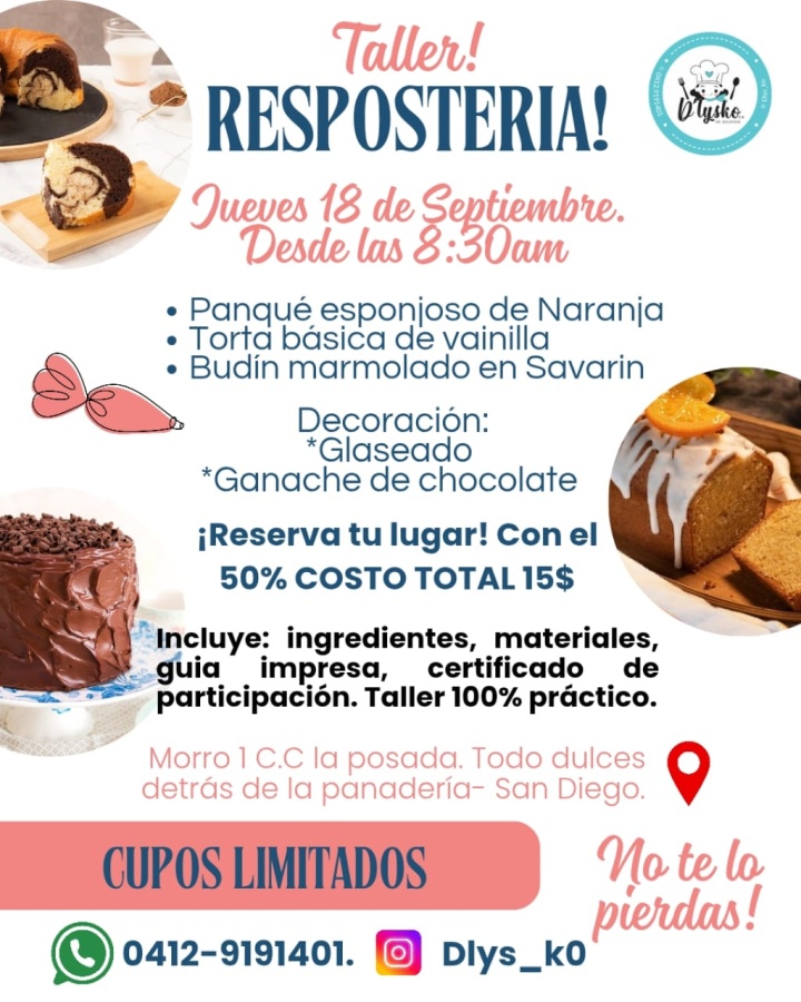 ¡Taller de repostería básica! Para el 18 de Septiembre. Dónde aprenderás a elaborar un delicioso. Panqué de naranja con glaseado. Torta básica de vainilla con ganache de chocolate. Budín marmolado estilo cebra cubierto de nevazucar. INCLUYE: Degustación, ingredientes, materiales, guía impresa, certificado de participación. Es un taller 100% participativo. UBICACIÓN: Morro 1, C.C. La Posada, Repostería Todo Dulces, San Diego. RESERVA con el 50% y el día del taller cancelas lo demás. Recuerda, no hay devolución de dinero, pero puedes transferir tu cupo a otra persona. Contacto: 0412-919.14.01.