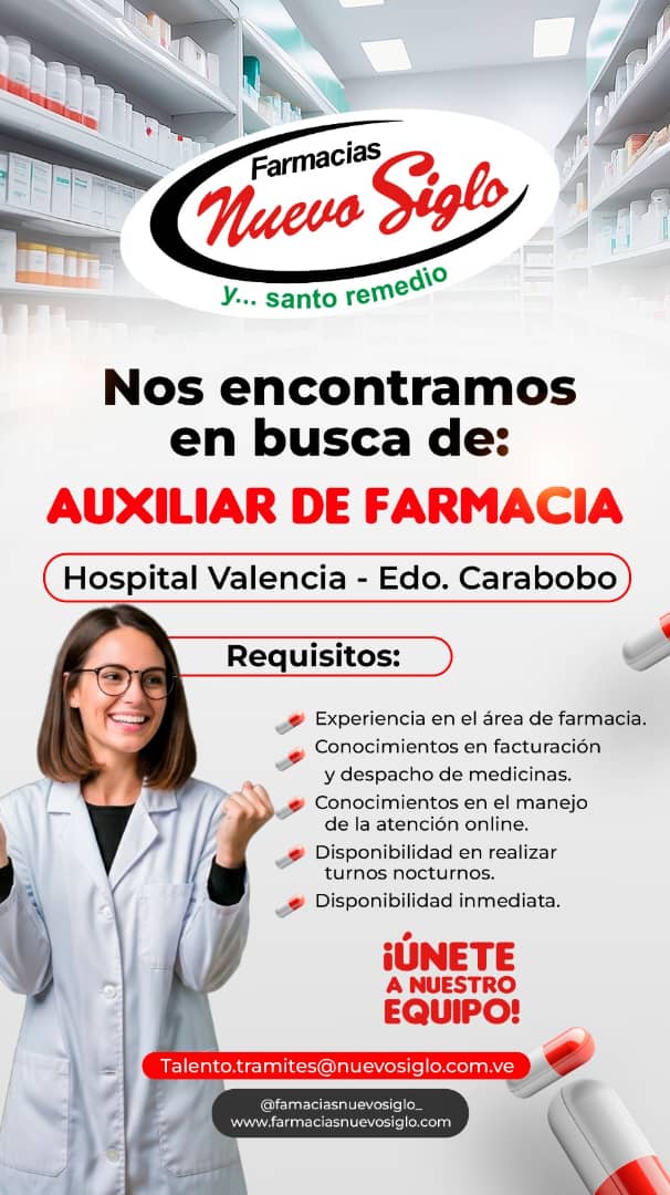 OFERTA DE EMPLEO. VALENCIA. En FARMACIAS NUEVO SIGLO Nos encontramos en busca de: AUXILIAR DE FARMACIA, para trabajar en Valencia - Edo. Carabobo. Sucursal Hospital Central - Av. Lisandro Alvarado. Con experiencia en el área de farmacia. Conocimientos en facturación y despacho de medicinas. Conocimientos en el manejo de la atención online. Disponibilidad en realizar turnos nocturnos. Disponibilidad inmediata. ¡ÚNETE A NUESTRO EQUIPO! talento.tramites@nuevosiglo.com.ve @farmaciasnuevosiglo_ www.farmaciasnuevosiglo.com