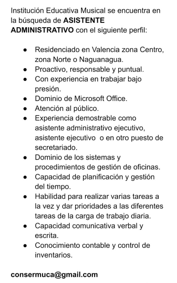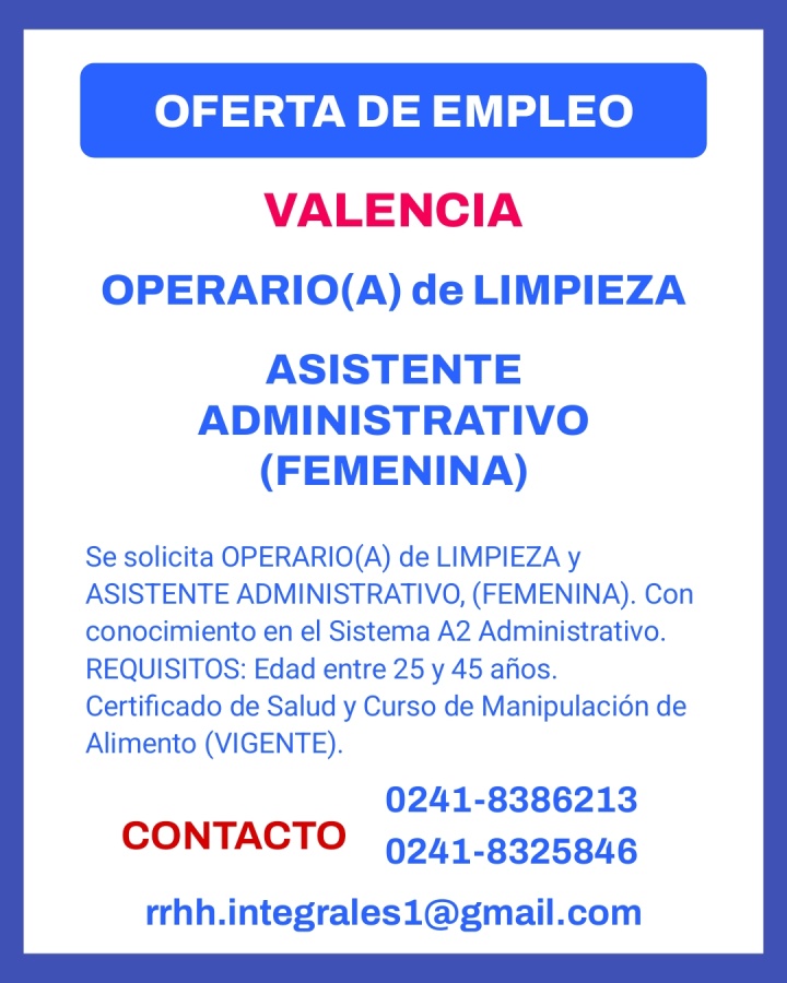 OFERTA DE EMPLEO. VALENCIA. Se solicita: OPERARIO(A) de LIMPIEZA y ASISTENTE ADMINISTRATIVO (FEMENINA) Con conocimiento en el Sistema A2 Administrativo. REQUISITOS: Edad entre 25 y 45 años. Certificado de Salud y Curso de Manupulacion de Alimento (VIGENTE) Telefonos: 0241-838.62.13, 0241-832.58.46. Correo: rrhh.integrales1@gmail.com