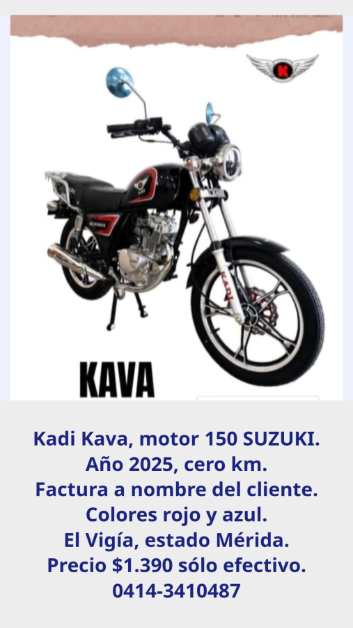 Disponible Kadi Kava, motor 150 SUZUKI. Año 2025 cero km. Factura a nombre del cliente. Colores rojo y azul. Ubicadas en El Vigía, estado Mérida. Precio: 1.390$, sólo efectivo. Interesados comunicarse al 0414-341.04.87.