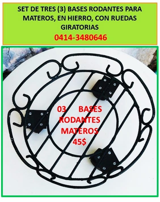 Se vende set de tres (3) bases rodantes para materos, en hierro, con ruedas giratorias. Información 0414-348.06.46