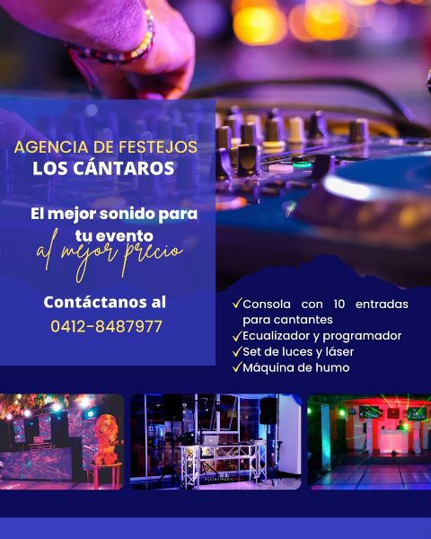 Agencia de Festejos Los Cántaros te ofrece el mejor sonido para tu evento al mejor precio. Consola con 10 entradas para cantantes, ecualizador y programador, set de luces y láser, máquina de humo. Contáctanos a través del 0412-848.79.77.